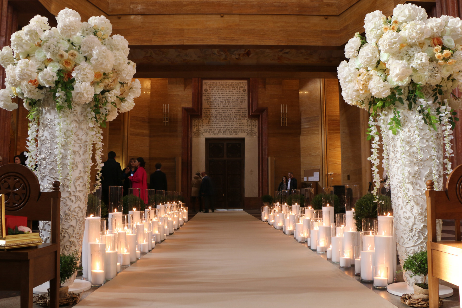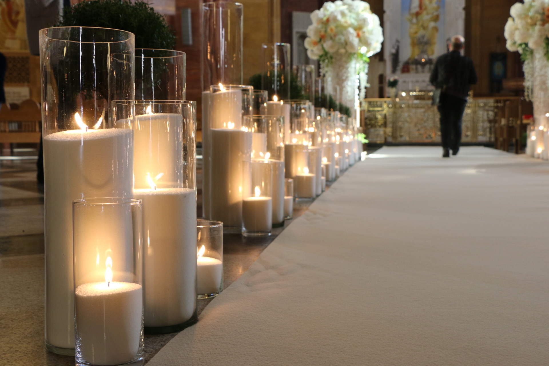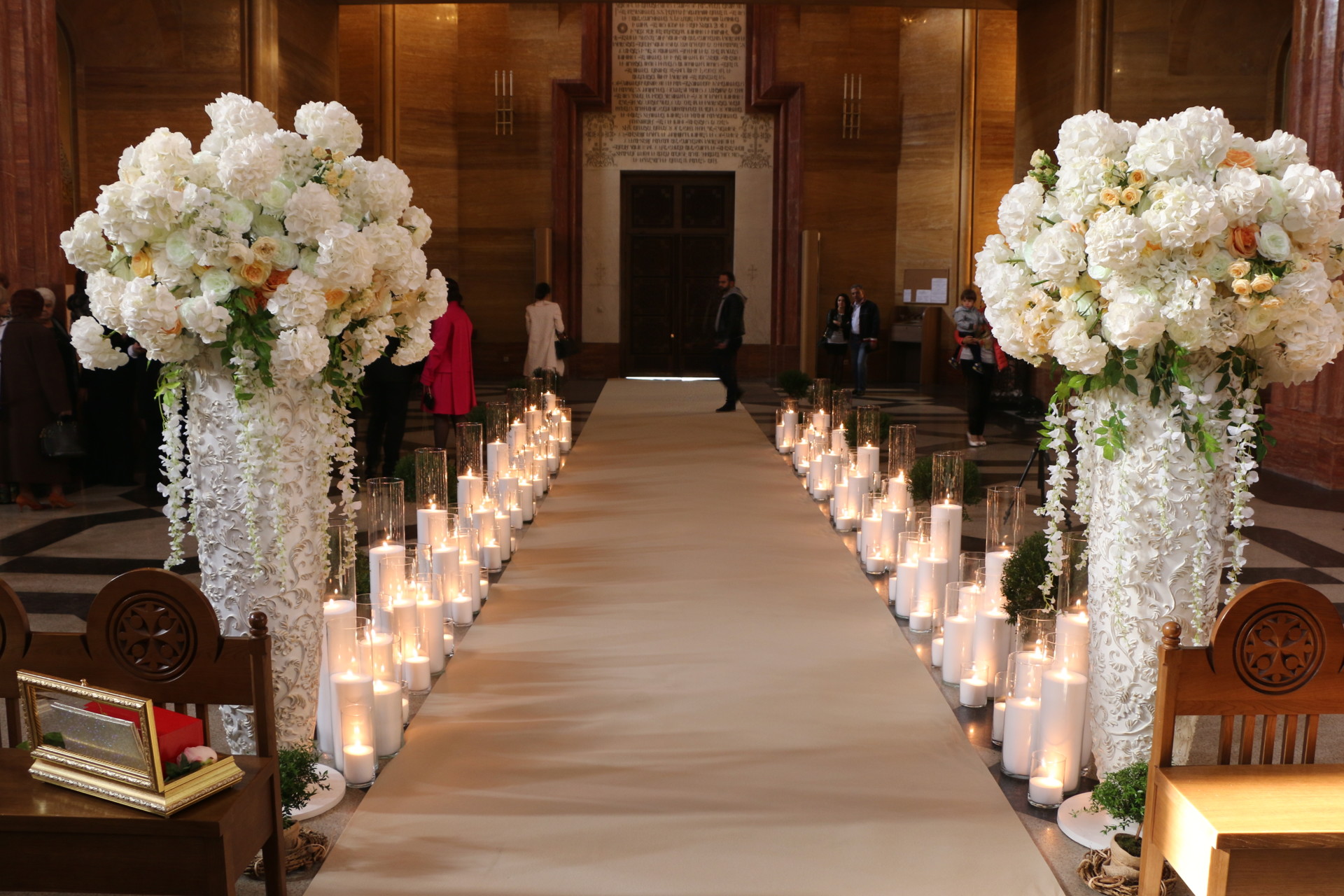 Декорирование дороги к алтарю свечами, цветами и декором. Длинна коридора 8,5 метров.