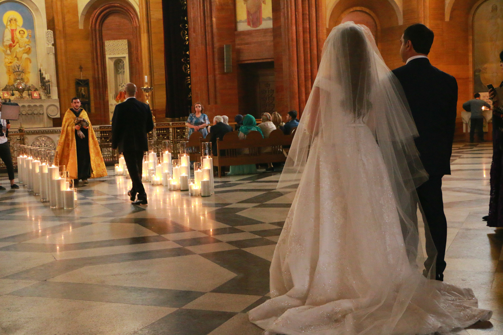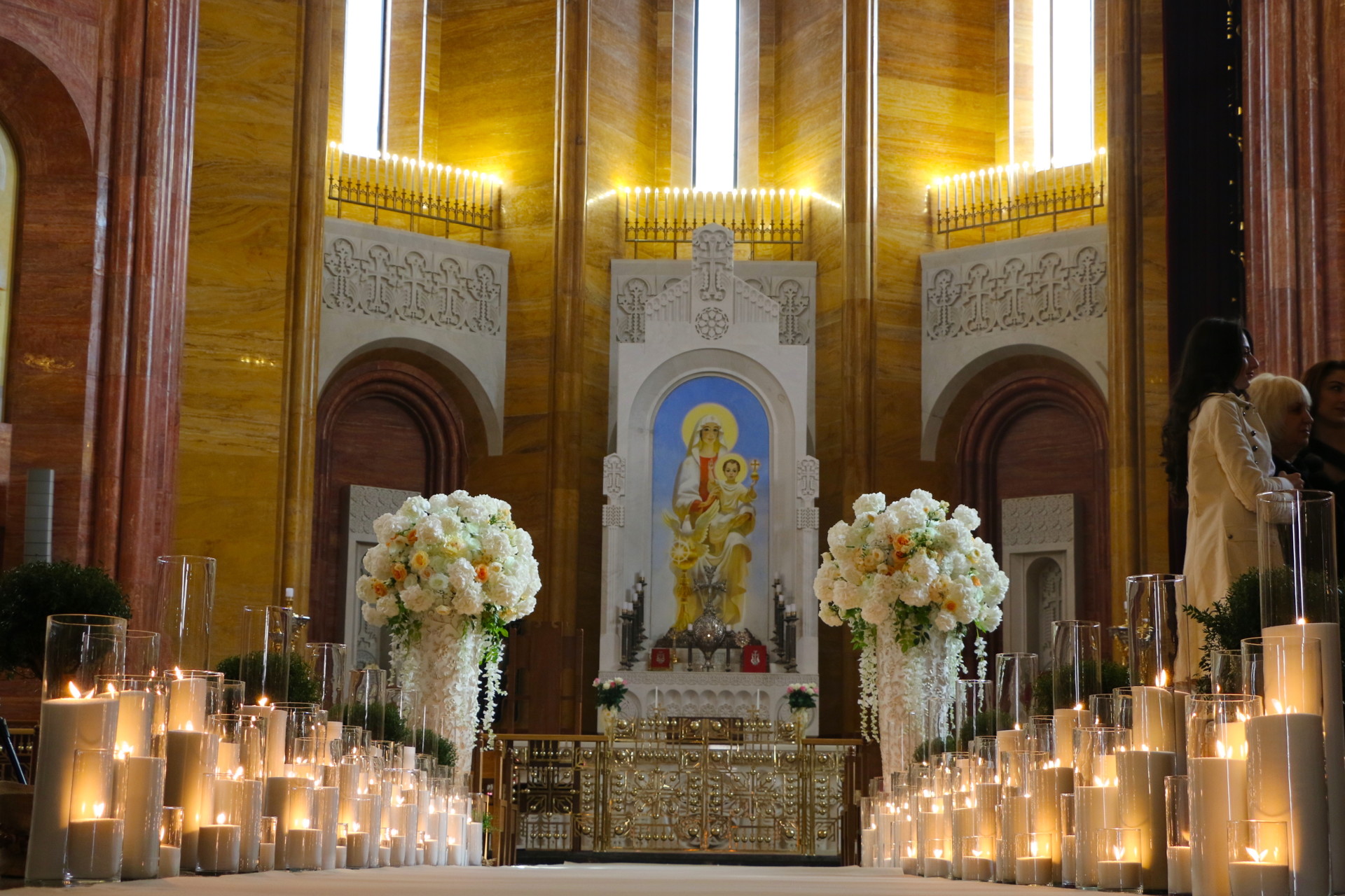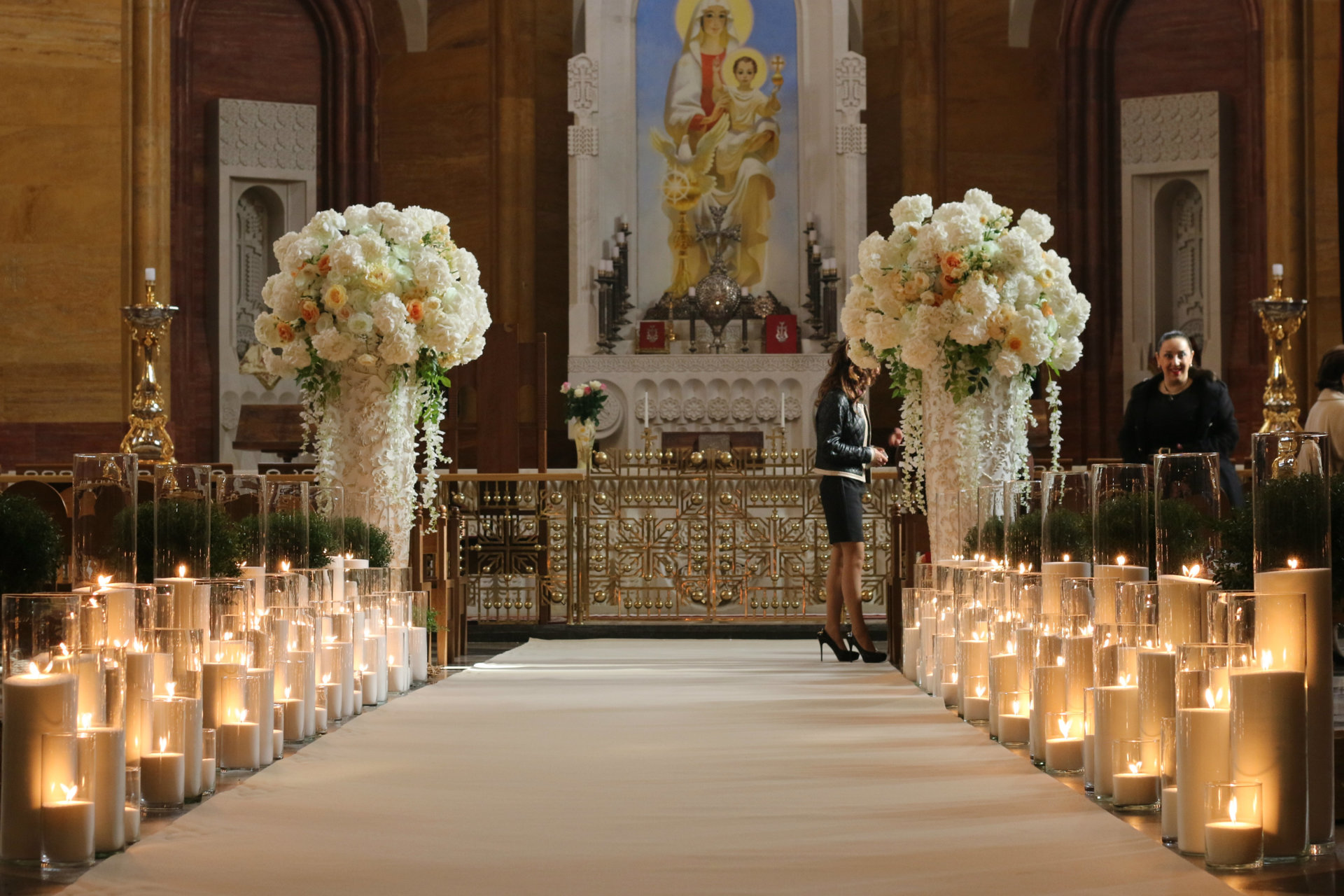 Декорирование дороги к алтарю свечами, цветами и декором. Длинна коридора 8,5 метров.