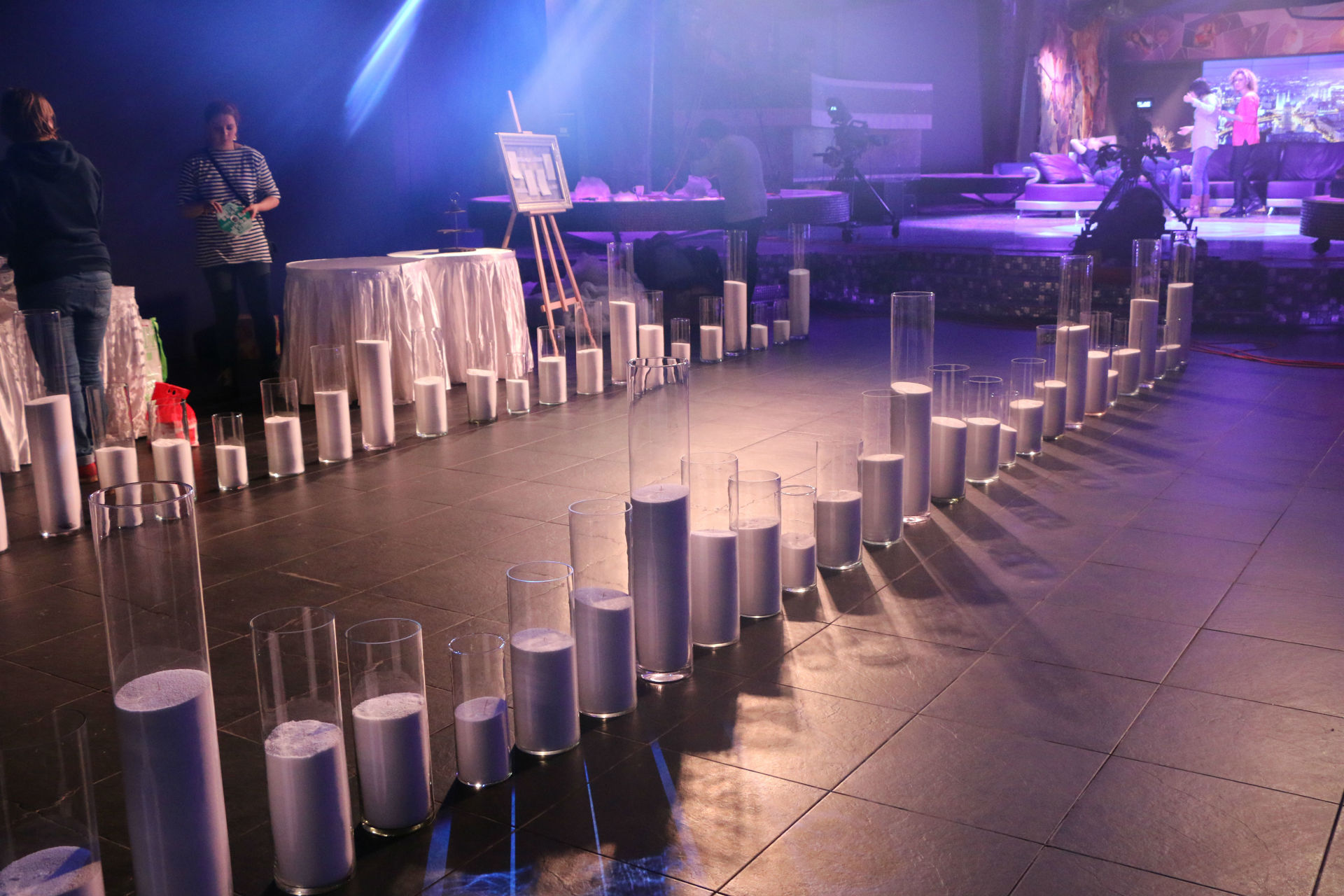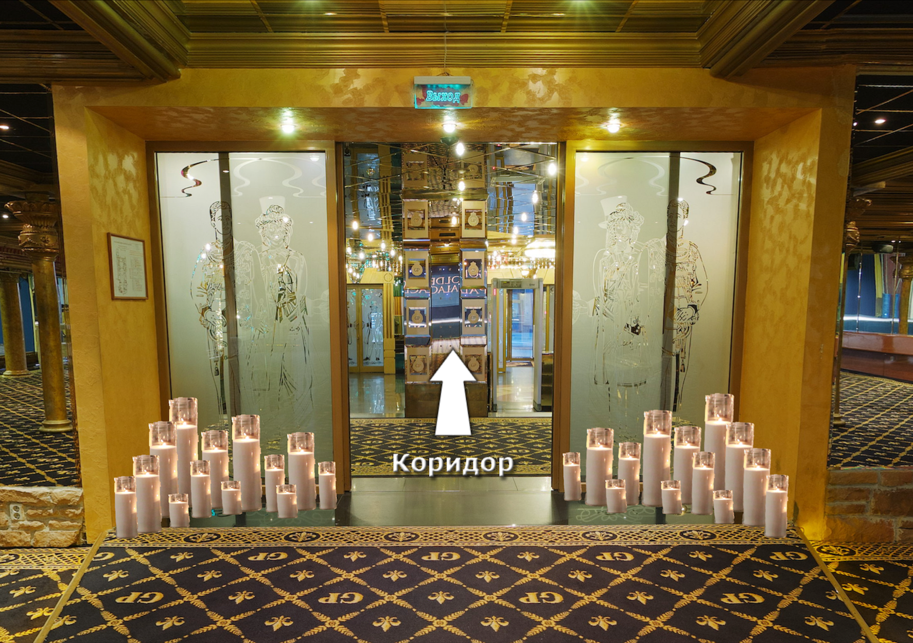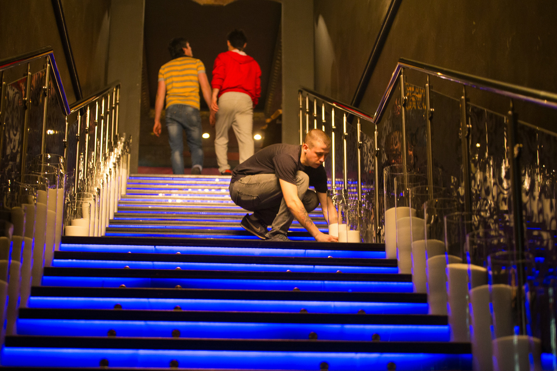 Главная задача - украсить свечами входную лестницу. Это 37 ступенек на которые по обе стороны мы разместили 74 свечи, высотой 50 см. Так же в основном зале мы оформили темные зоны еще 76 свечами размером от 15 до 60 см в высоту.