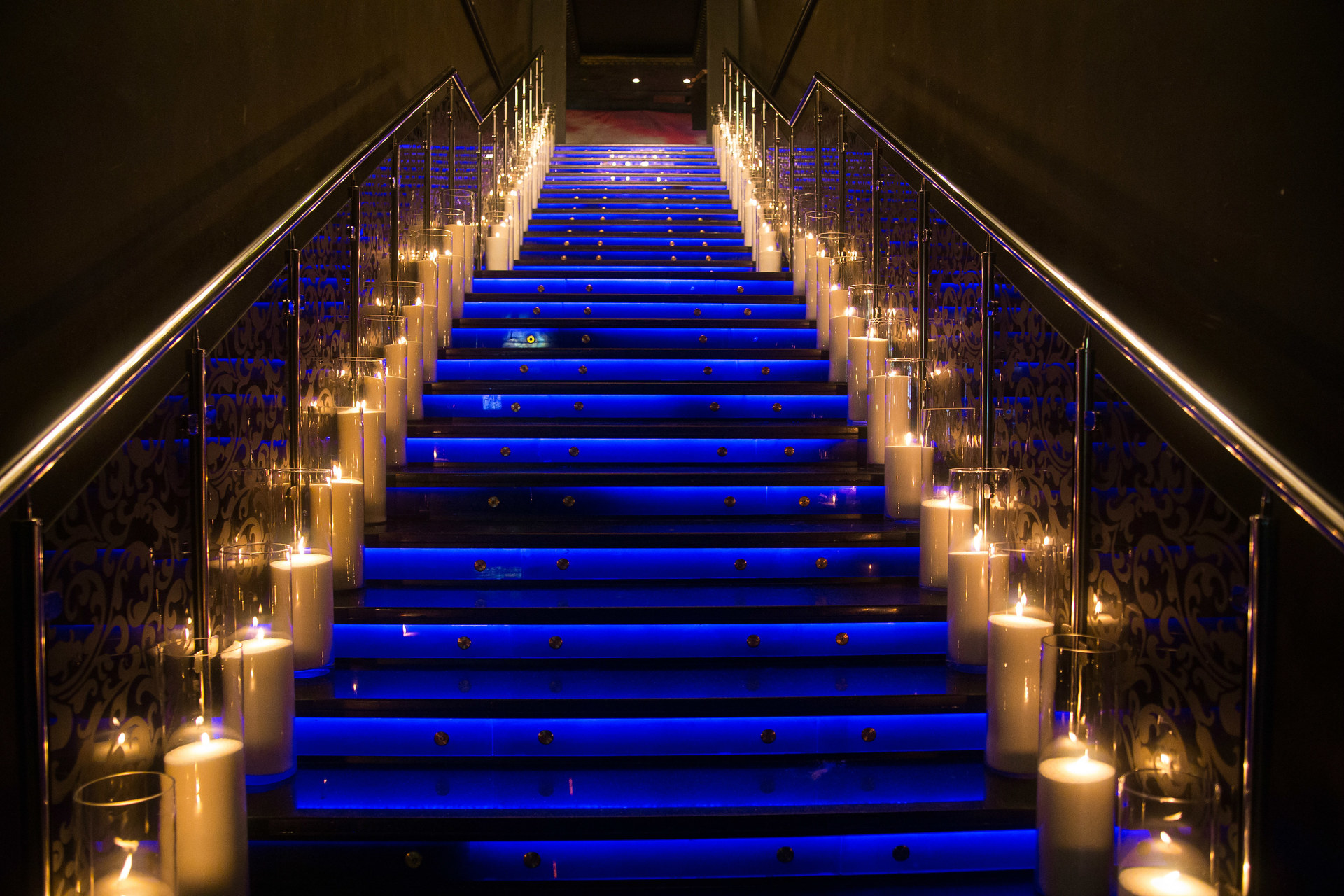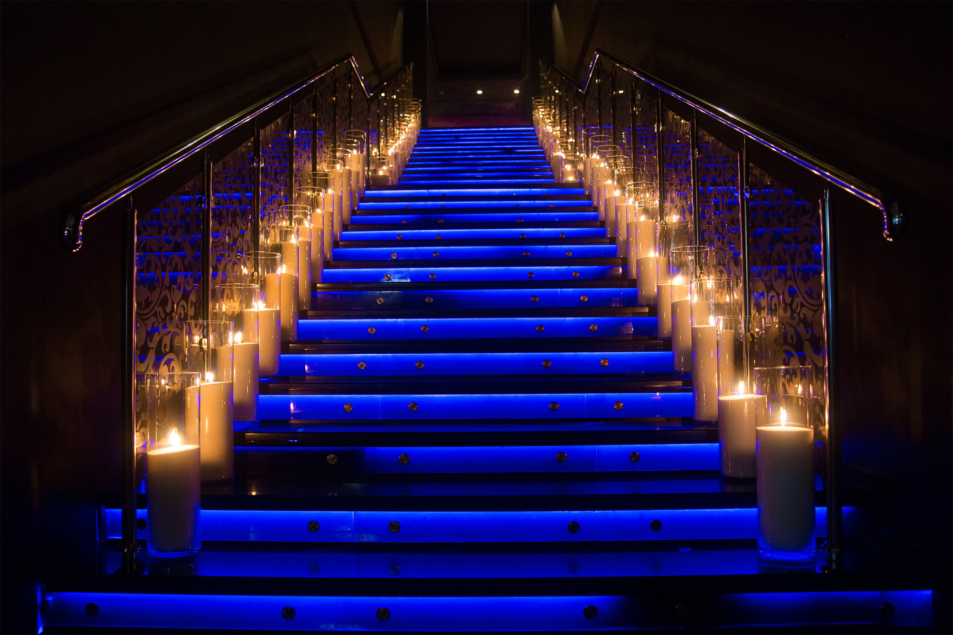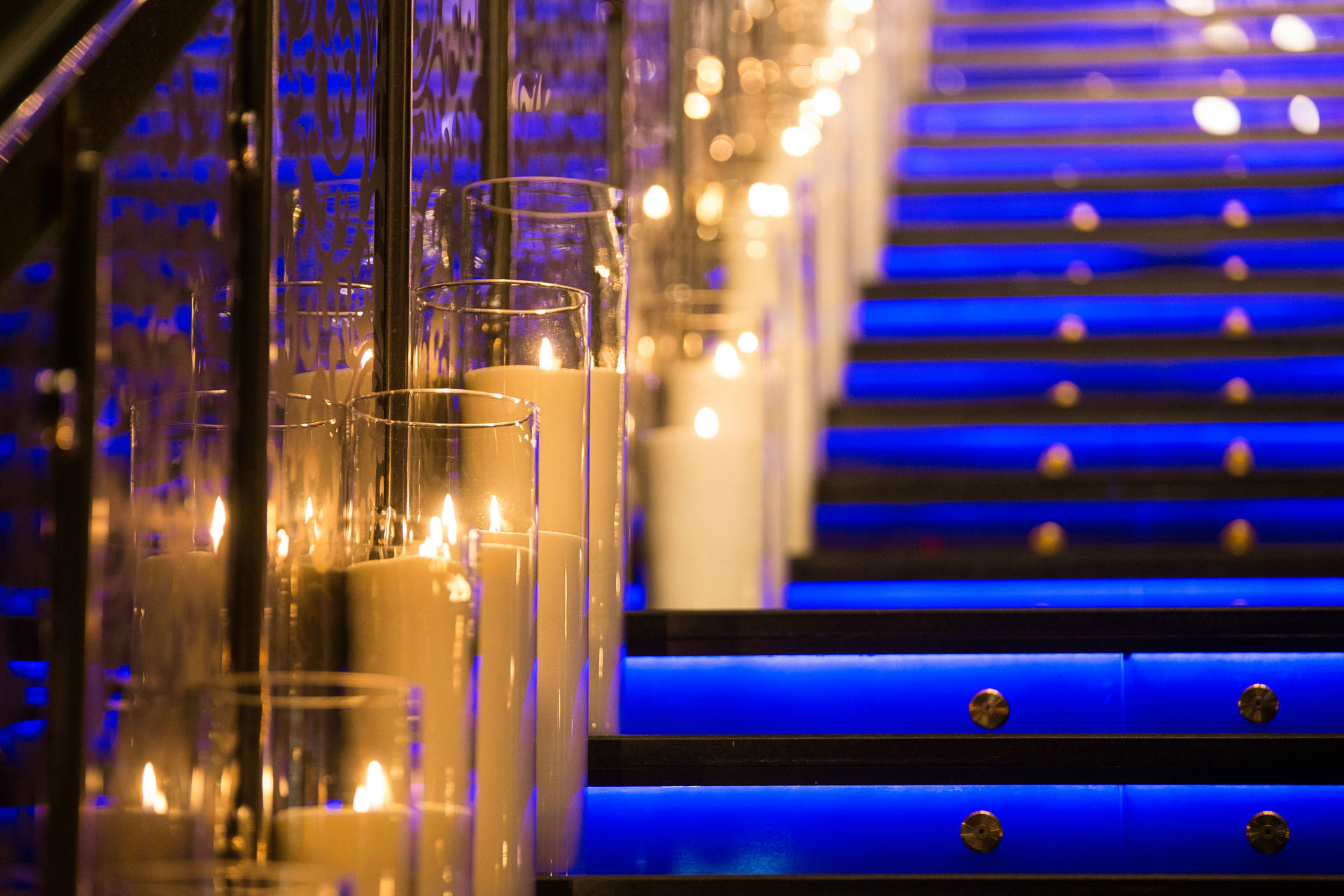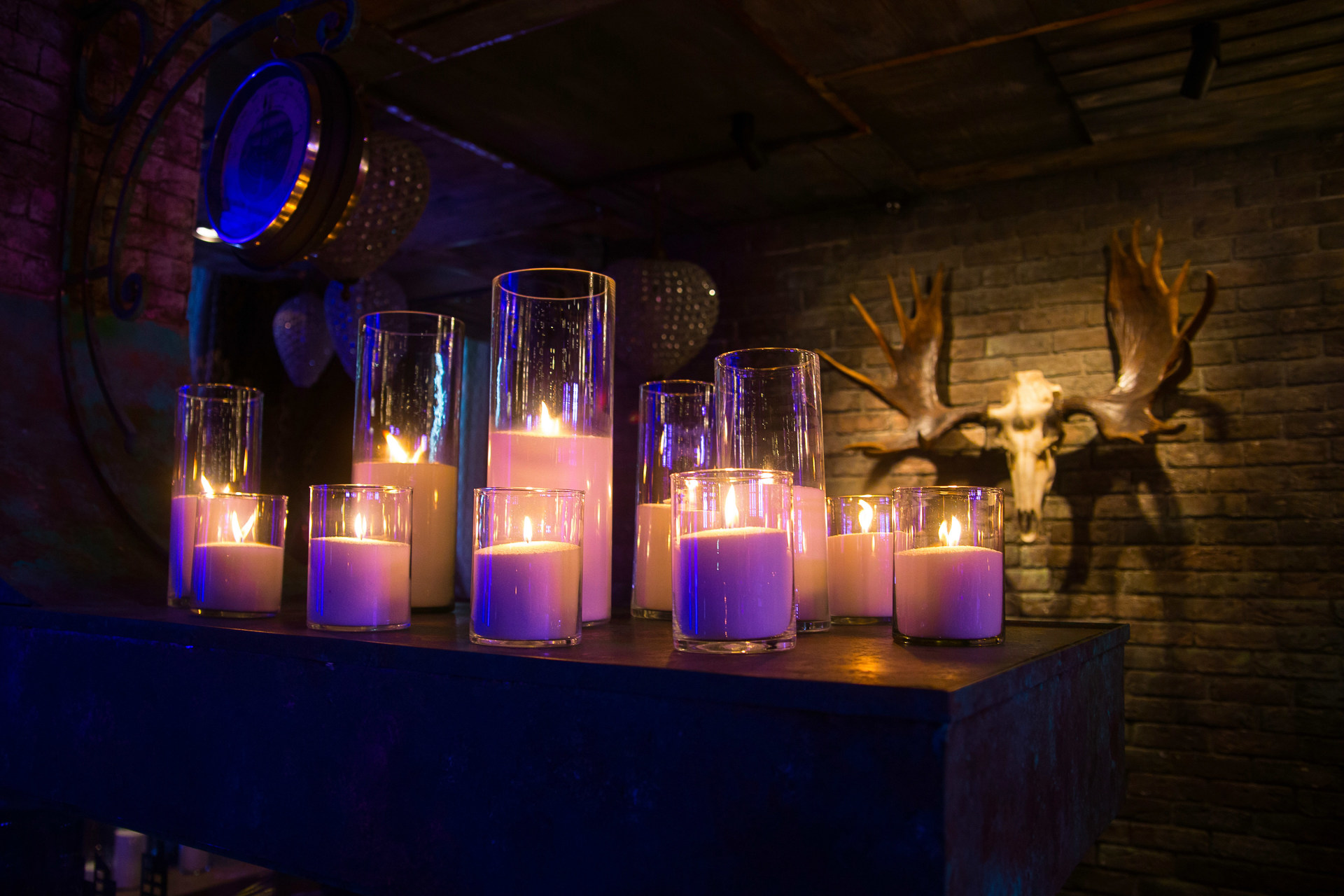 Главная задача - украсить свечами входную лестницу. Это 37 ступенек на которые по обе стороны мы разместили 74 свечи, высотой 50 см. Так же в основном зале мы оформили темные зоны еще 76 свечами размером от 15 до 60 см в высоту.